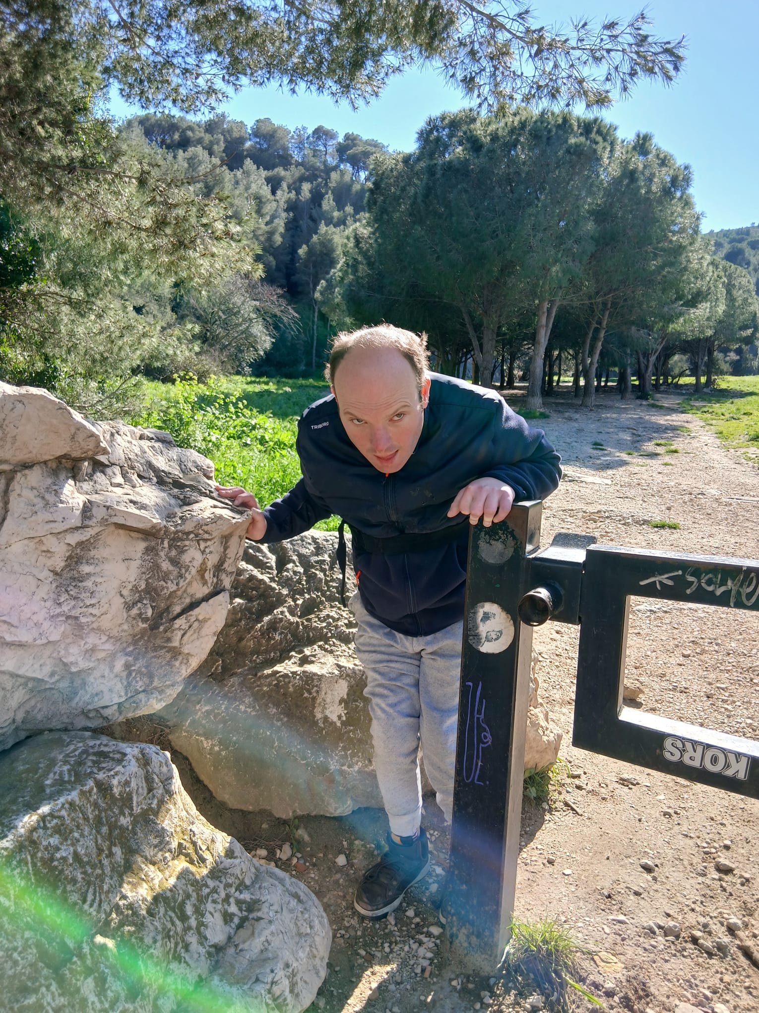 Nous allons jusqu’au parc des évadés au parking des Baumettes. Pas facile de franchir cette barrière mais avec de la patience et un peu d’astuce on y arrive. Nous marchons dans l’herbe à côté des cordées de grimpeurs débutants. Puis au retour Jéjé veut continuer et nous allons jusqu’au monument aux morts. Bravo Jéjé ! Grosse sieste bien méritée et nous partons ensuite avec Annick à l’anniversaire de Marie-Thé, les bras chargés de délicieux mets que nous avons préparés. Christophe se joint à nous. Belle soirée à la salle paroissiale de Mazargues avec surtout un superbe concert très engagé de l’ami de Sabine que l’on peut écouter sur YouTube « un chanteur utile ». Jéjé aux premières loges a pris un plaisir fou.