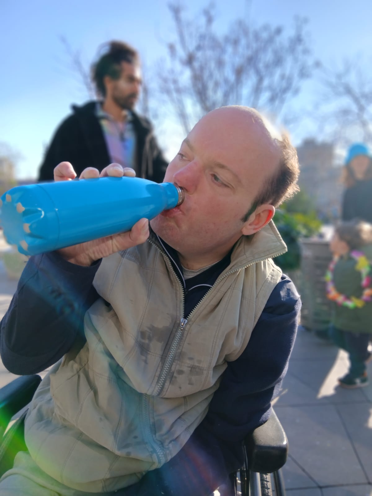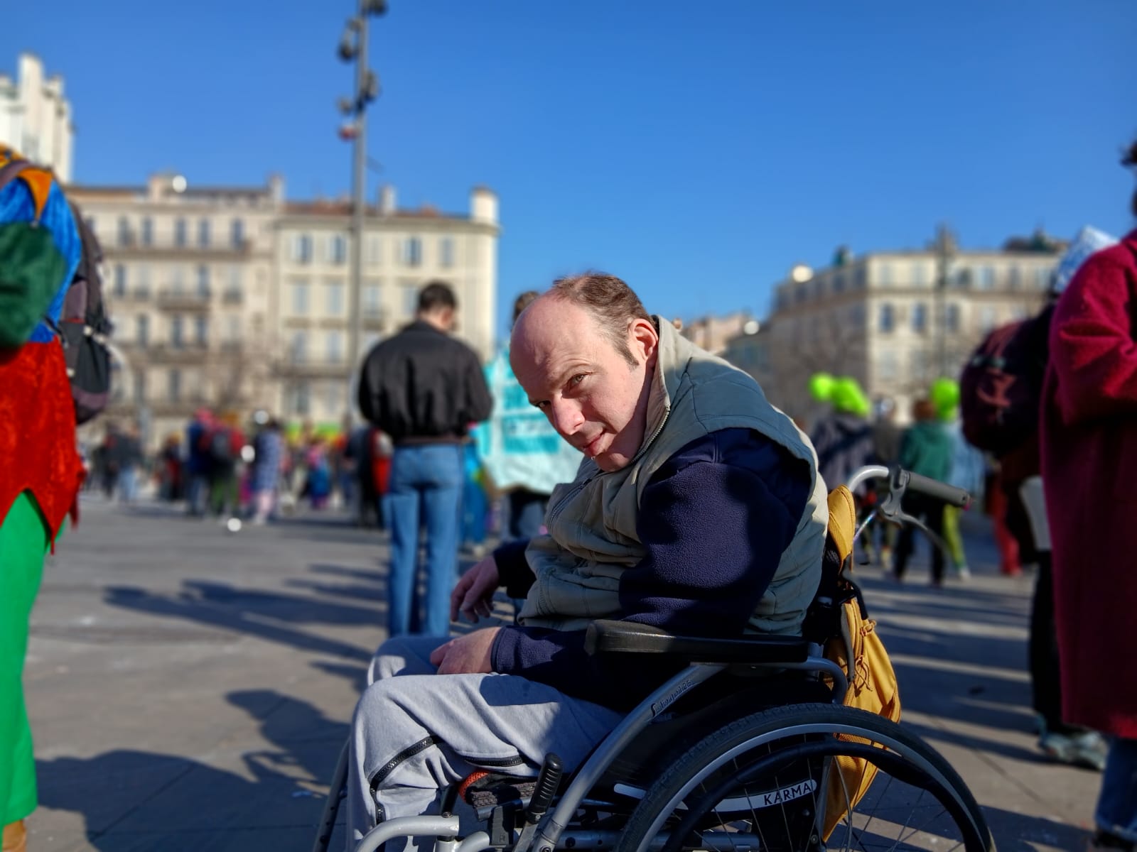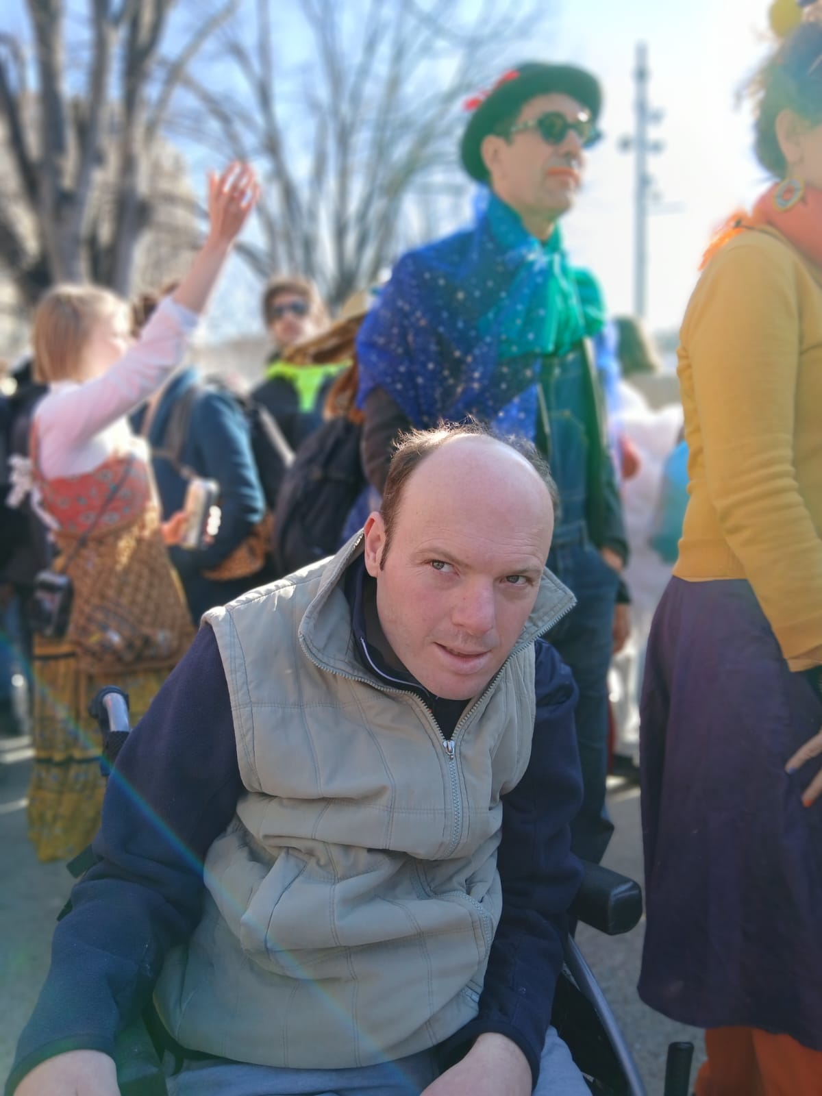 Somnolant durant le trajet, Jéjé en fauteuil retrouve le sourire grâce à cette foule déguisée, au son des batucadas et des jongleurs. Petit goûté sur la place et nous retrouvons Annick. Le soir, je peine à le mettre aux toilettes tant il a du mal à se déplacer et l’aide de Christophe n’est pas de trop pour le coucher.
