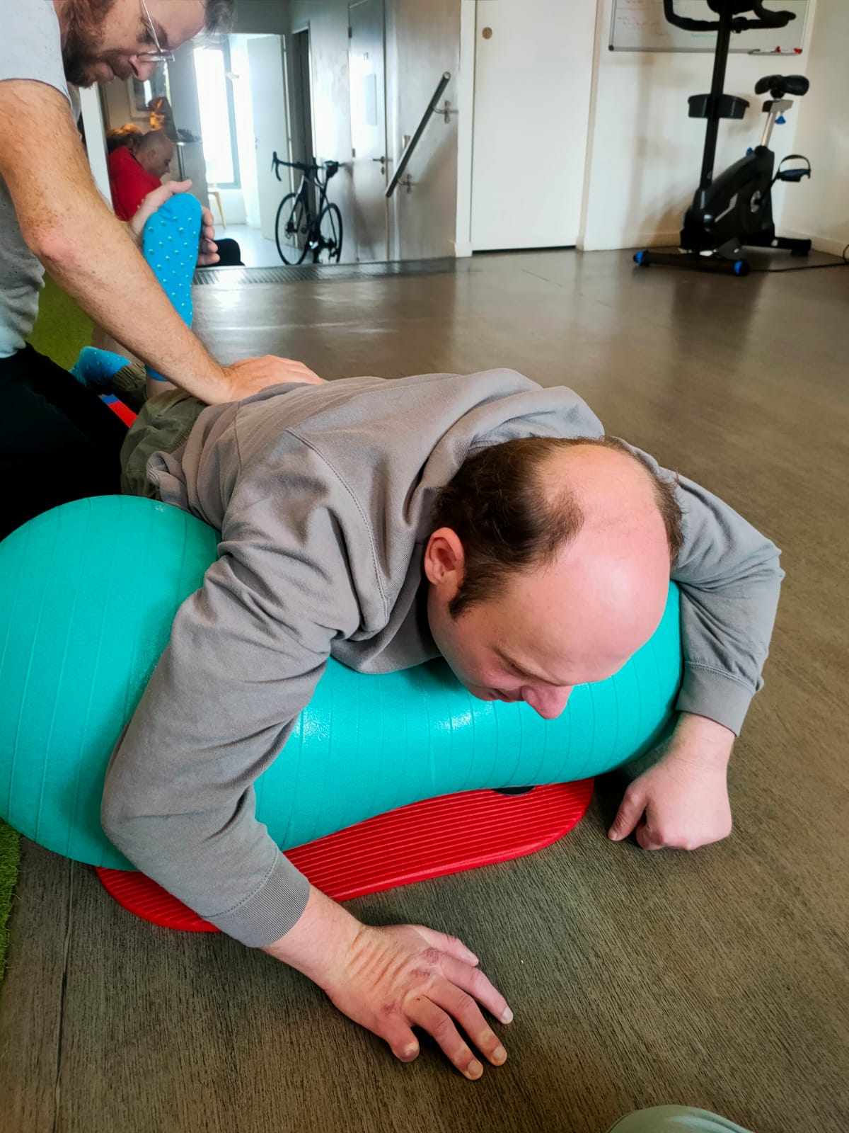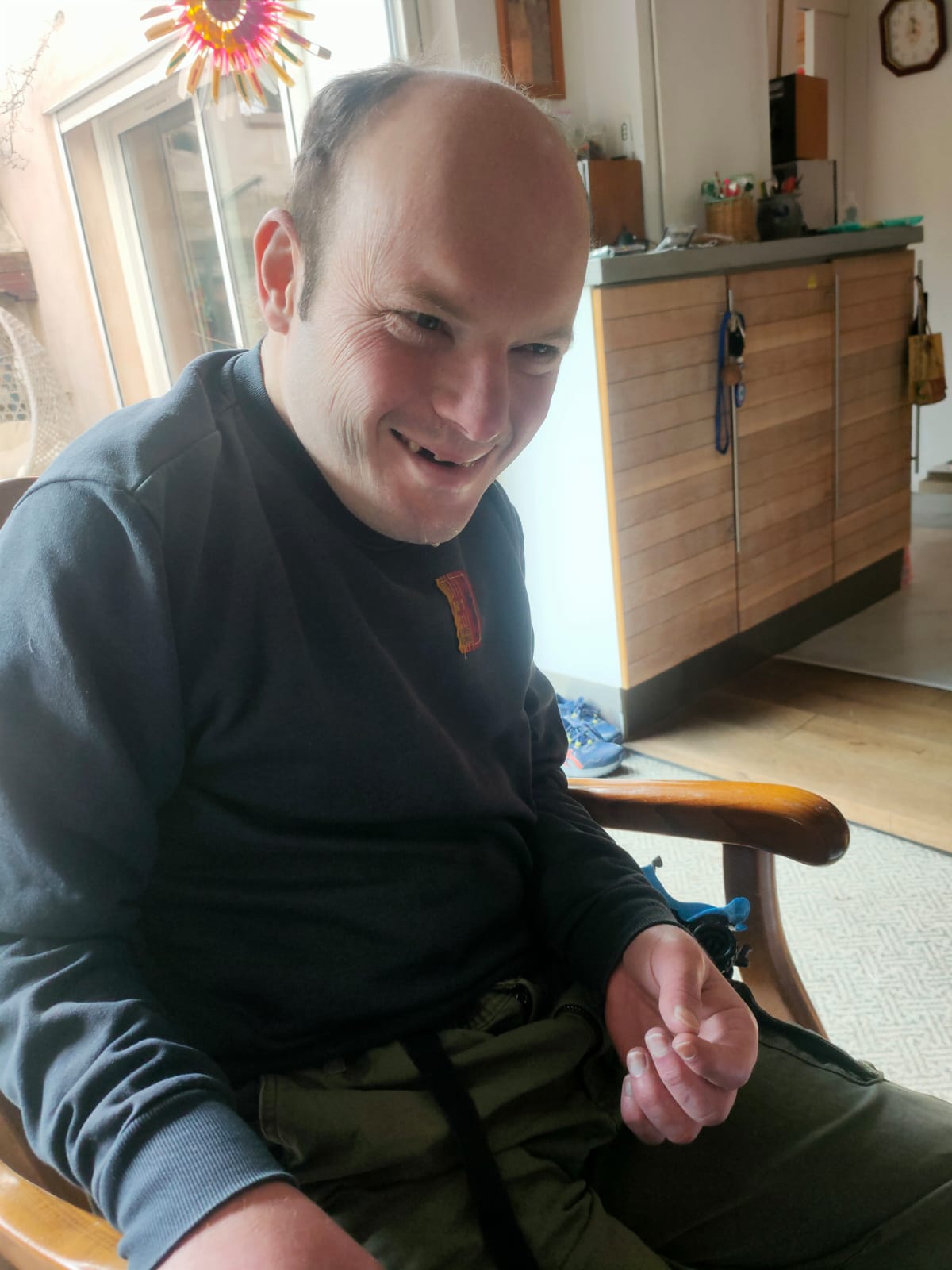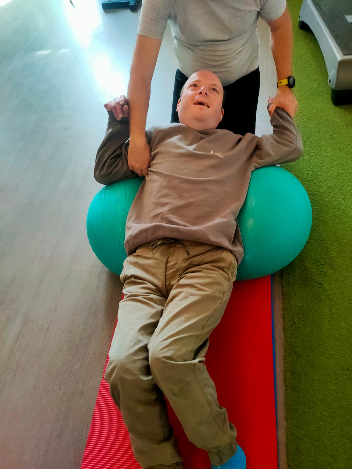 Je retrouve Jéjé bien fatigué, mais néanmoins avec une amélioration par rapport à ma dernière session avant son séjour à la Timone. Il marche avec un peu plus d’équilibre même s’il a besoin pour ça qu’on le soutienne. Il dort très souvent (dès qu’il n’est pas en mouvement) et fatigue assez vite dans les activités diverses.