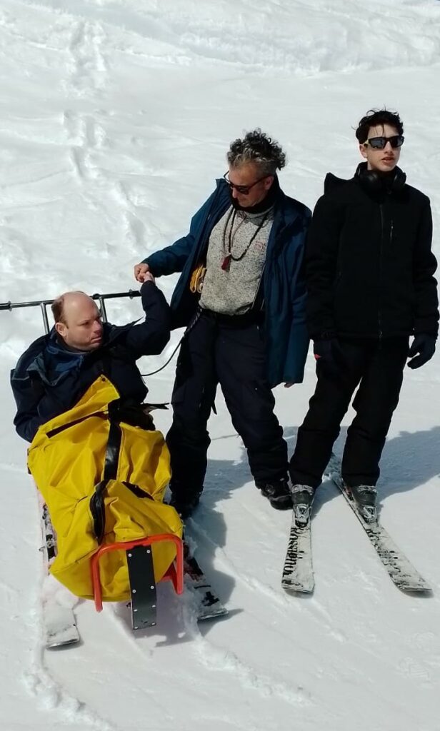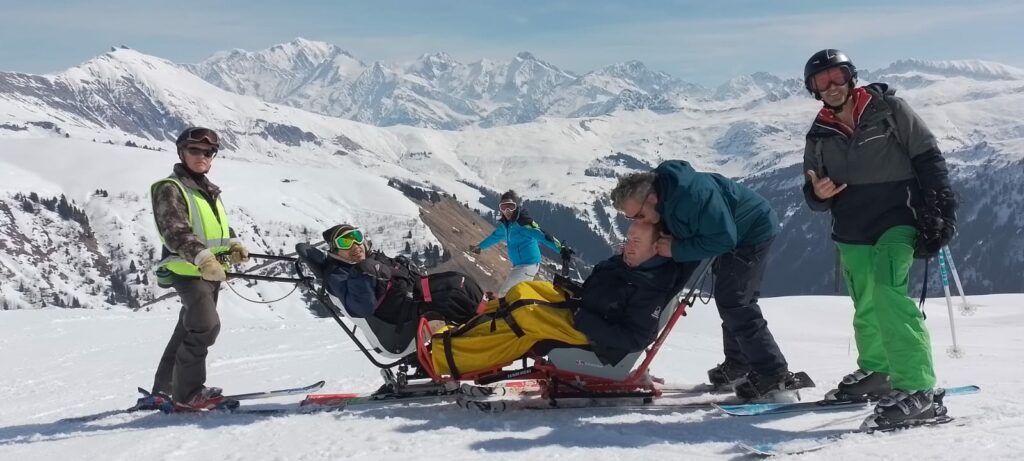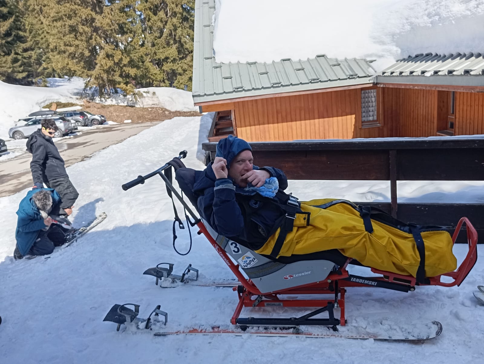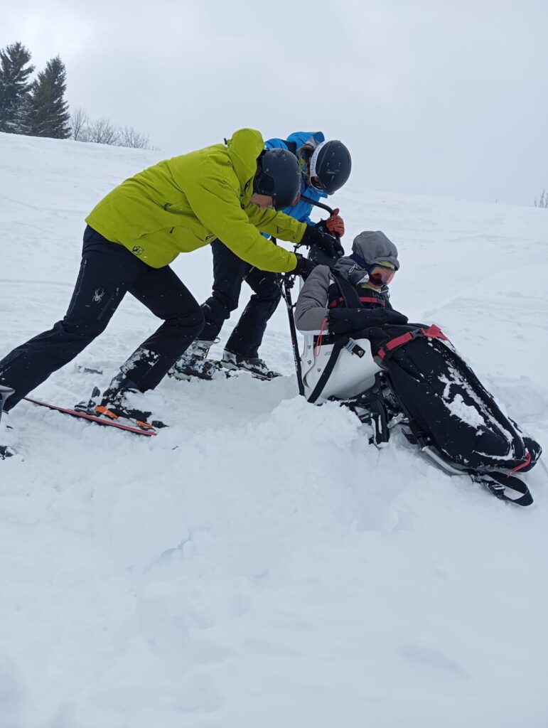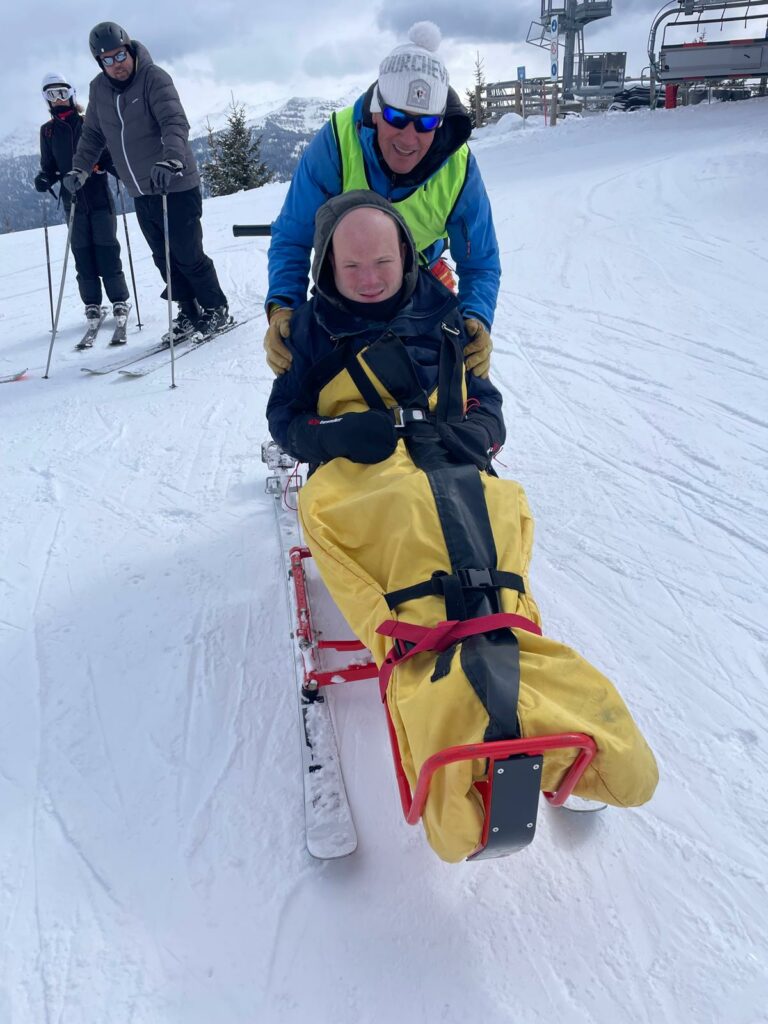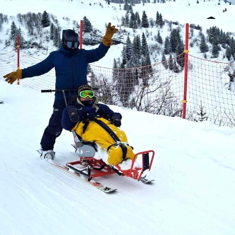 Mourad fait son baptême de pilote de fauteuil-ski, avec Greg dans le fauteuil ! On ferme les yeux … on ne veut pas voir ça … quand on rouvre les yeux, à notre grande surprise, ils sont tous les deux indemnes en bas de la piste.