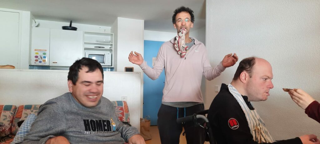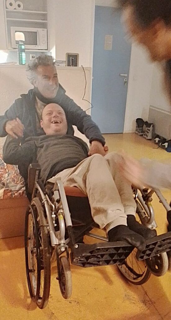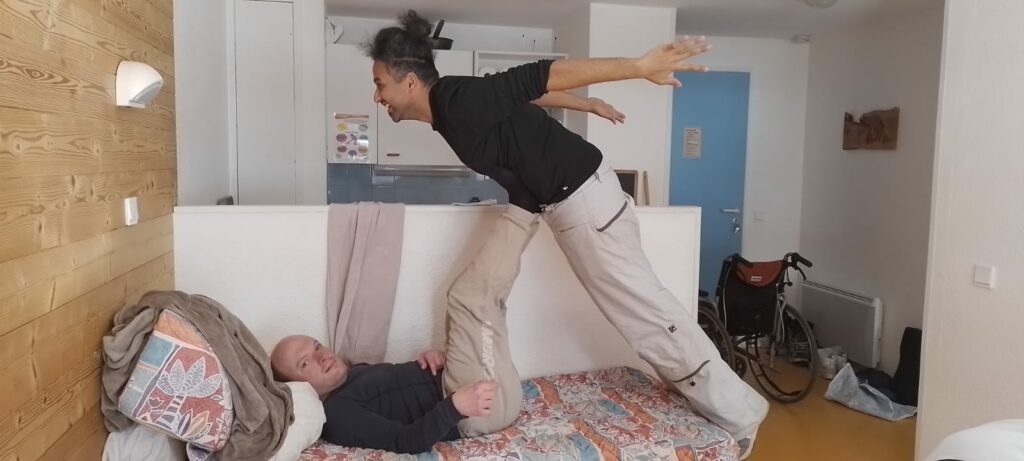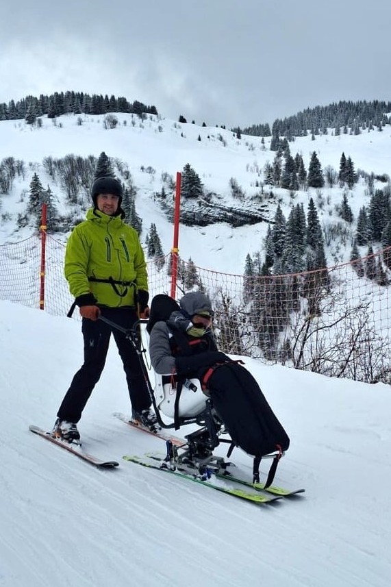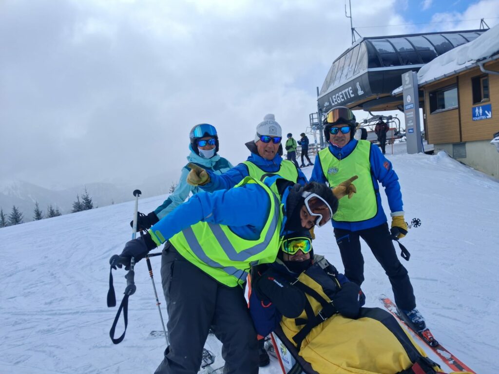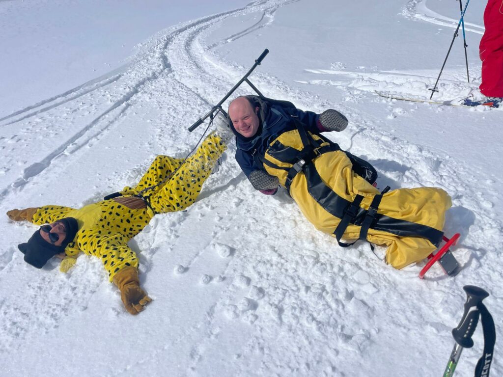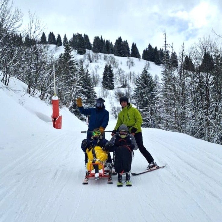 Mourad fait son baptême de pilote de fauteuil-ski, avec Greg dans le fauteuil ! On ferme les yeux … on ne veut pas voir ça … quand on rouvre les yeux, à notre grande surprise, ils sont tous les deux indemnes en bas de la piste.