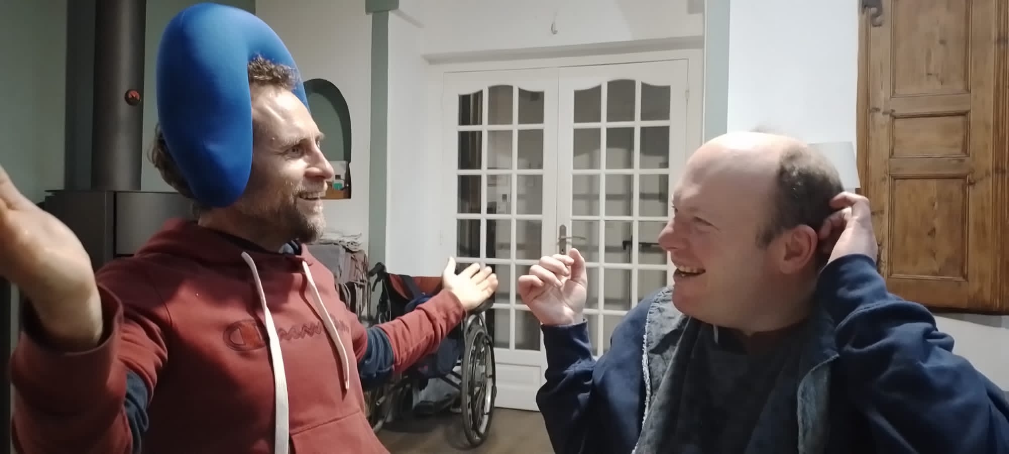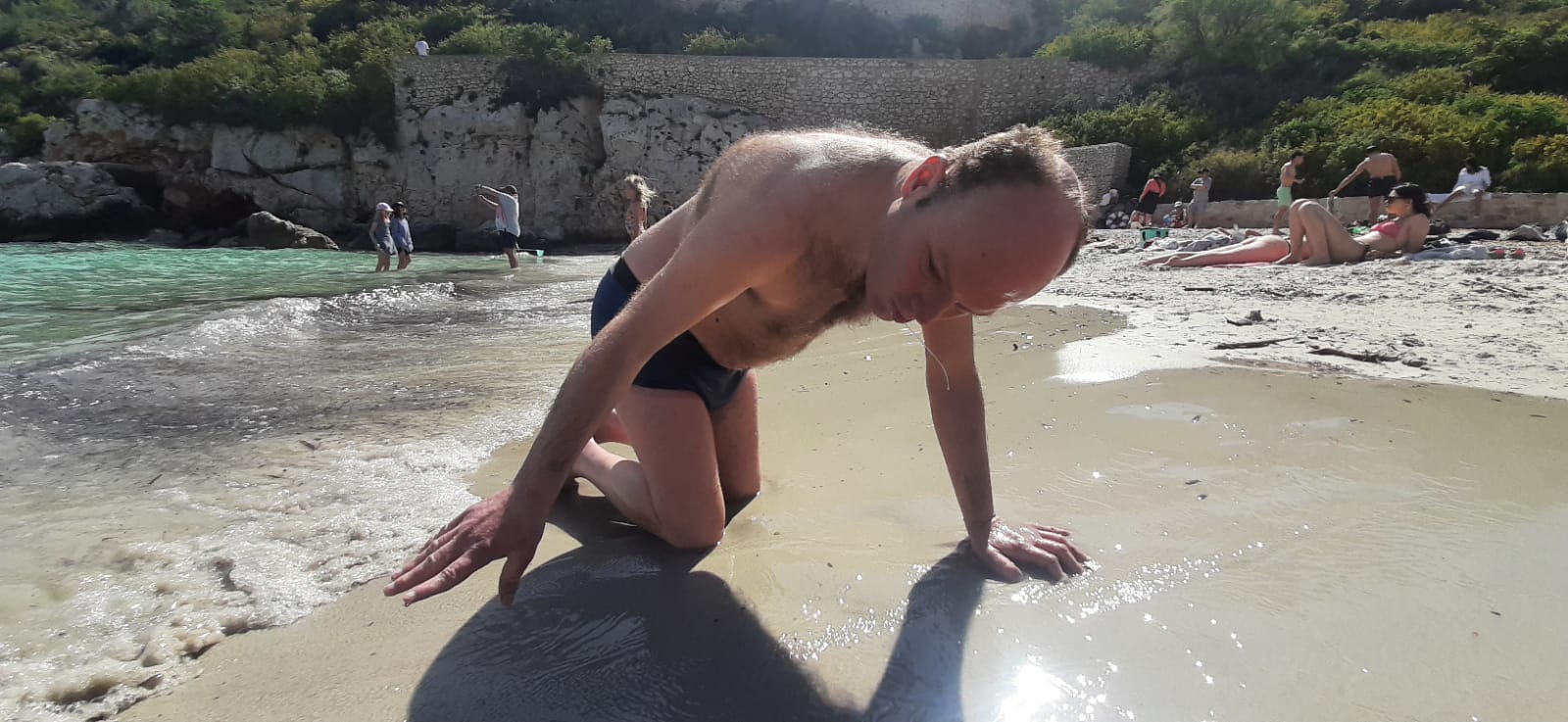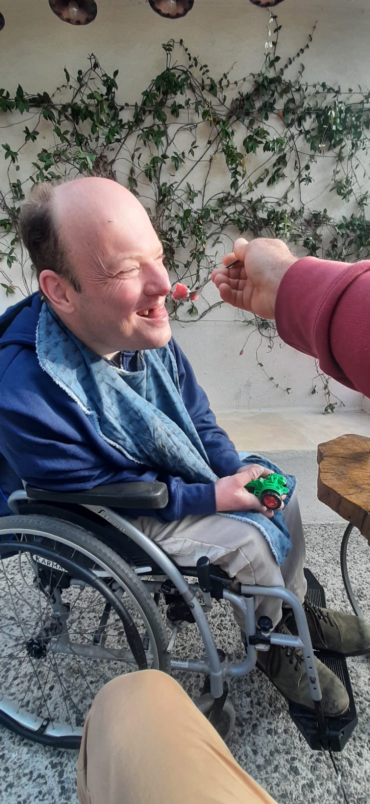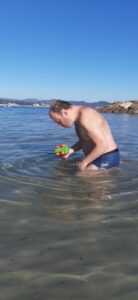 Jéjé refait surface et est de nouveau bien éveillé… le secret : l’eau. (et les méds !!!, ajoute Annick) Il peut être un peu somnolent, mais si vous l’emmenez à la mer ou à la piscine, il « resurfe » ! 😊🐋 Djamel le fait marcher dans l’eau et on s’amuse autour de lui, il est bien.