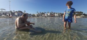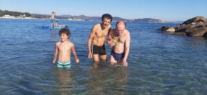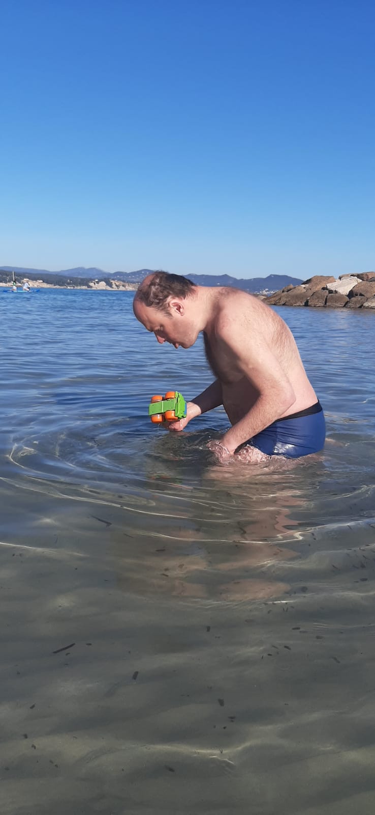 Jéjé est comme un béluga dans l’eau… au top ! On marche dedans, on fait plusieurs allers-retours depuis la plage, il joue au bord, puis on se baigne : c’est top. Jéjé est dans son élément…