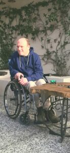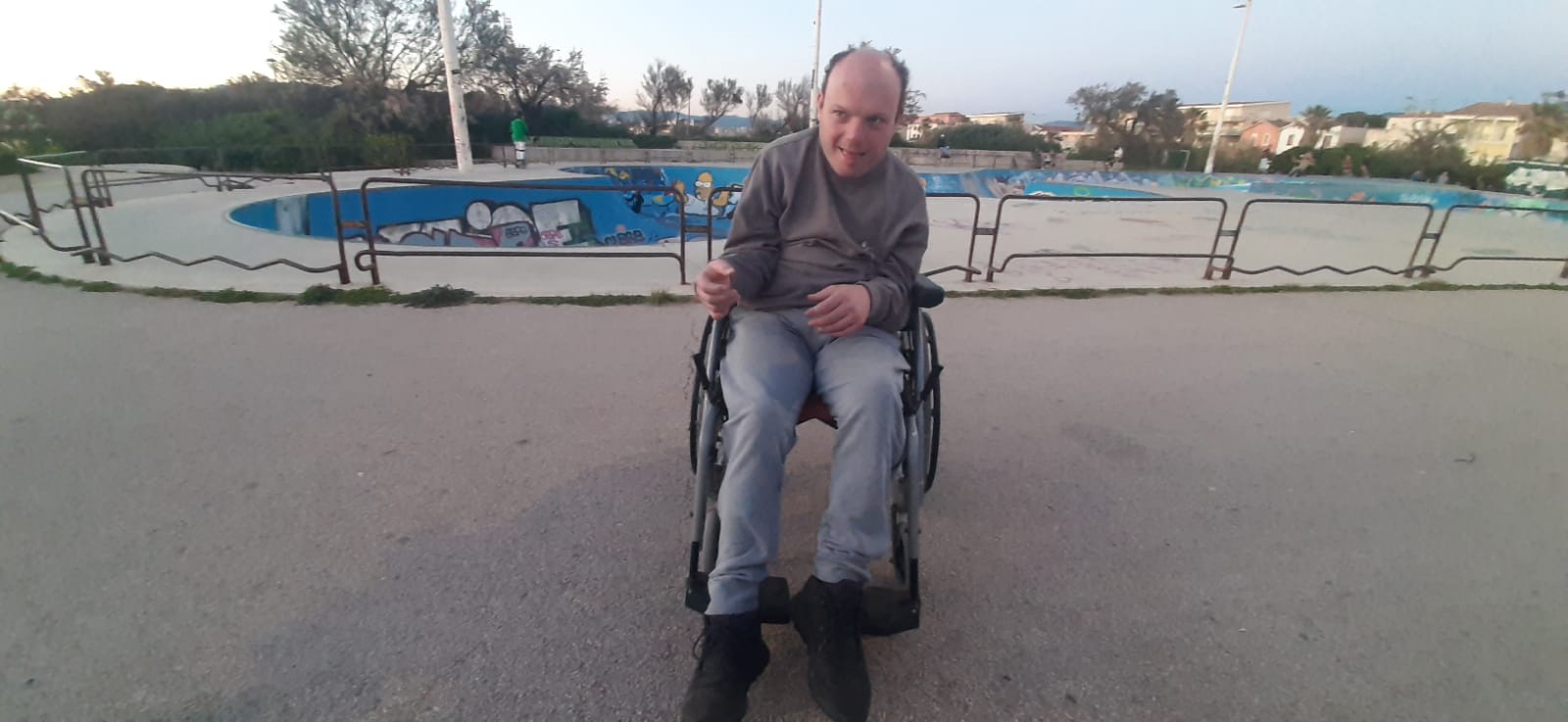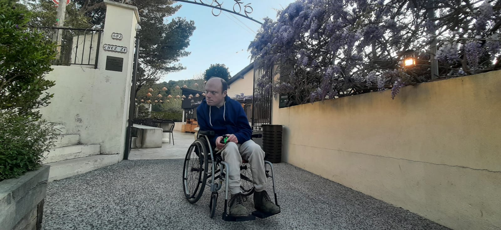 Moi, j’ai la chance de le retrouver souriant et éveillé ce jour-là, le midi et le soir, car l’après-midi : grosse sieste. À son réveil de fin d’après-midi, nous sommes allés tous les deux prendre l’air dans le quartier, mais en fauteuil (pour éviter de me retrouver en difficulté comme Mathilde quelques jours avant — Jéjé peut se figer et rester statique, sans qu’on puisse le déplacer, sans vraiment être alerté ni voir la chose arriver).