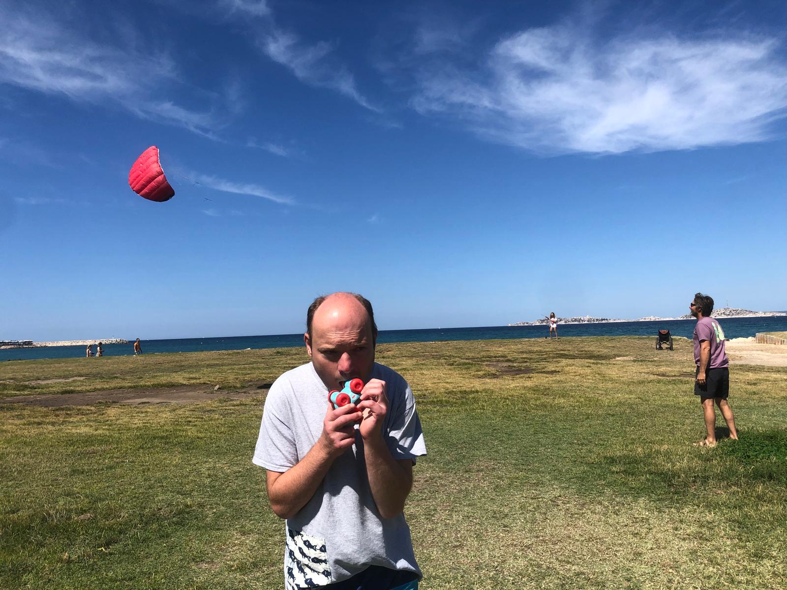 Manu est de retour on avait prévu une matinée à Sormiou mais les calanques sont fermées pour tout le WE pour risque incendie alors on va se balader entre le parc Borely et la Vieille Chapelle! Jéjé est en forme il marche super bien, c’est génial de le voir aussi bien dans sa verticalité! Il a quand même l’obsession de se diriger vers le parking pour se mettre dans une voiture mais on ne le laisse pas faire et on l’entraîne vers la mer…