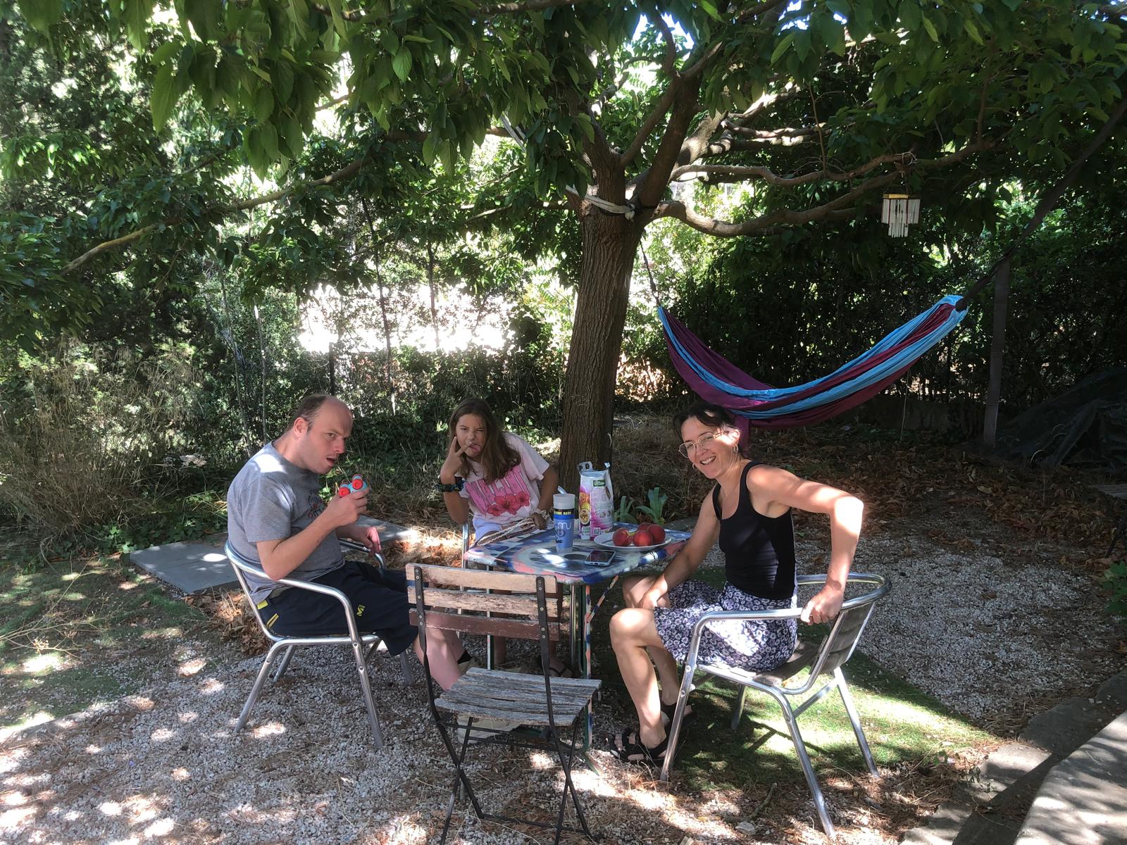 Je retrouve mon frère qui a fait la semaine précédente! Repas de midi en famille avec Samuel Estelle mes parents et Manu puis aprèm piscine! Jéjé est bien, mais pas très en lien. Il est surtout sous l’influence de son ventre!!!