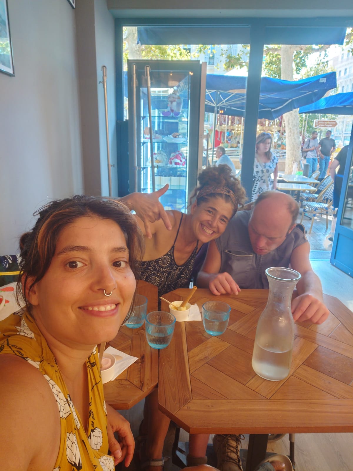 Jéjé se lève seul de son lit et après un bon petit déjeuner, nous avons la visite de Pipo les bras chargés de victuailles qui ne résistent pas à notre Jéjé..C’est qu’il a un appétit d’enfer…Baignade à la piscine du jardin et petite sieste puis c’est parti… Dans le coffre de la voiture, pique-nique, affaires de baignade et fauteuil au cas où…nous commençons par le rdv du kiné. Aie aie aie c’est que Jéjé s’endort dans la voiture et je le booste pour le tenir éveillé. C’est Mathieu qui s’occupe de lui mais Jéjé a décidé de ne pas se laisser faire et résiste à toutes manipulations. Séance qui a bien fait transpirer Mathieu. Nous enchainons par une bonne baignade à la pointe rouge. L’eau est délicieuse. C’est l’été marseillais ! Puis pique-nique à l’ombre près des cabanons sur un fauteuil et une table prêtés gentiment par une dame. Petite douche et c’est reparti. Nous prenons ensuite la navette maritime de 15h pour le vieux port. Sous l’ombrelle une chanteuse à la voix suave nous ravit les oreilles. Ma fille Lucie nous rejoints et nous allons manger une bonne glace à l’atelier du glacier près du vieux port. Double tournée pour Jéjé…Puis petit moment à la bibliothèque de l’Alcazar. Juste avant la fermeture Jéjé ressent le besoin d’aller visiter les toilettes…  C’est parfait. Puis apéro panisses et limonade avec Lucie pour reprendre ensuite la navette de 20h avec le couchant de soleil…