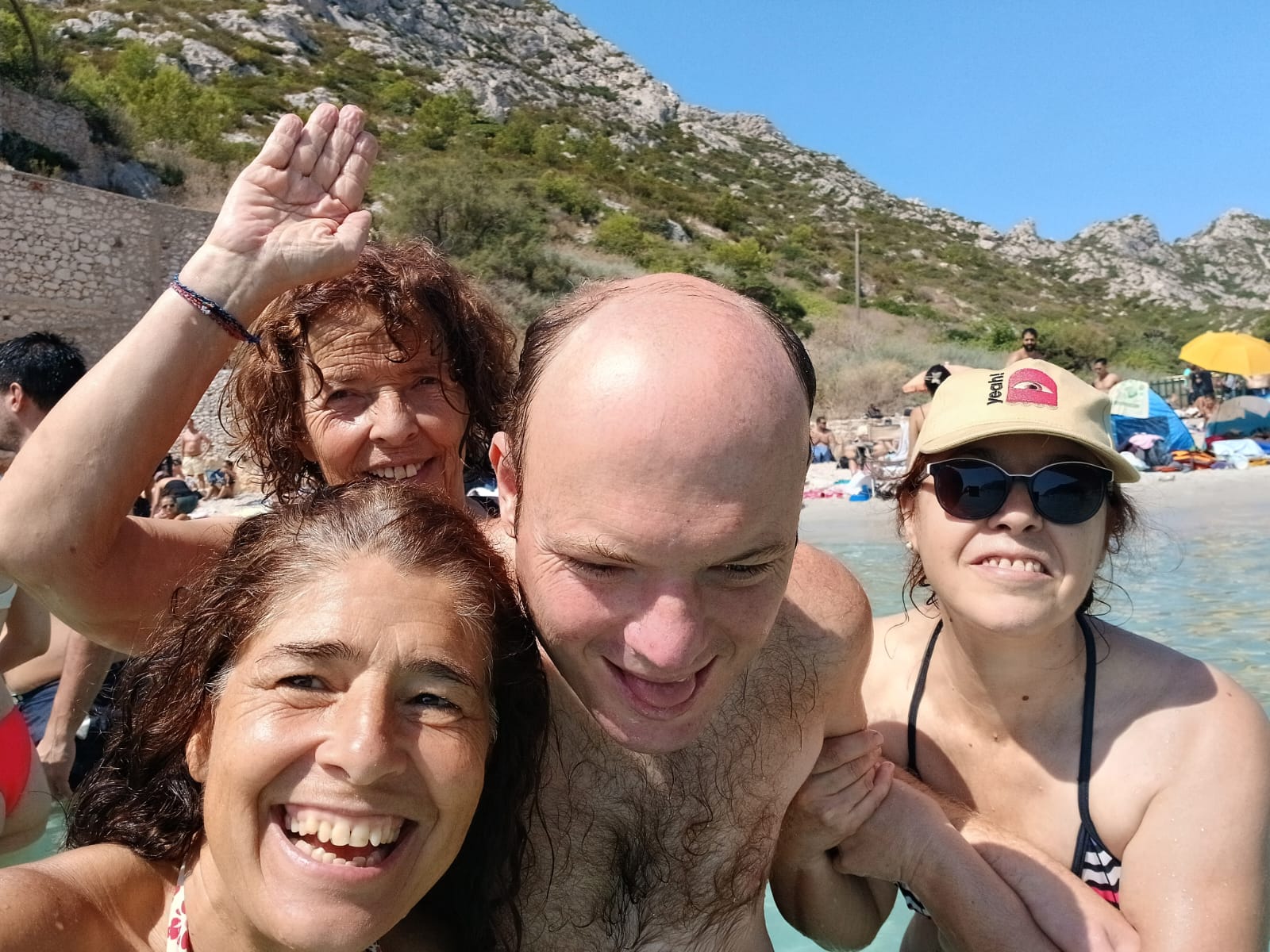 A 10h30 nous voilà d’attaque pour Sormiou avec cette fois Laurence et Françoise. Sur le parking du bas les places se font rares, messe du 15 août oblige. Laurence et Jéjé assistent bien assis et à l’ombre à quelques sermons du prêtre, le temps pour moi de me garer. Puis direction la plage. N’oublions pas nos objectifs. L’eau est toujours aussi chaude et Jéjé est comme un poisson dans l’eau. Dommage que nous n’ayons pas eu le droit à la visite du requin bleu égaré l’après-midi même à Sormiou… Petite rincette à la piscine puis déjeuner avec toute la troupe au jardin. S’en suit une bonne sieste avant l’arrivée de Radia et Corentin et de leurs magnifiques filles pour une belle fin d’après-midi à la piscine et un délicieux repas tous ensemble.