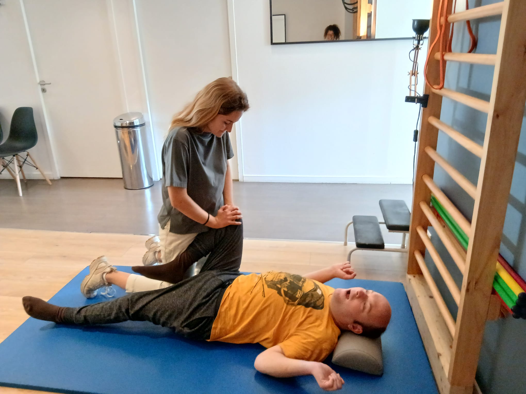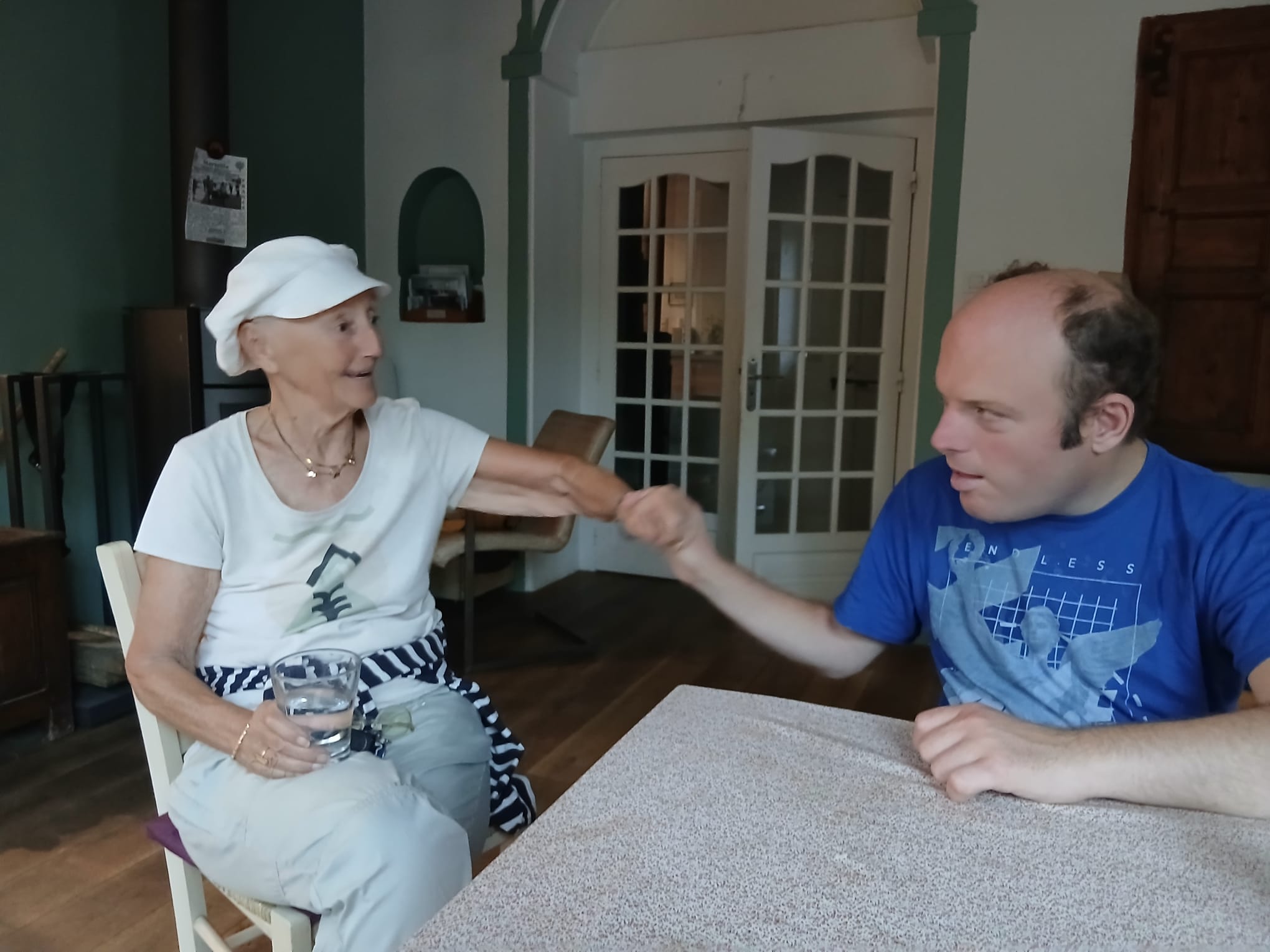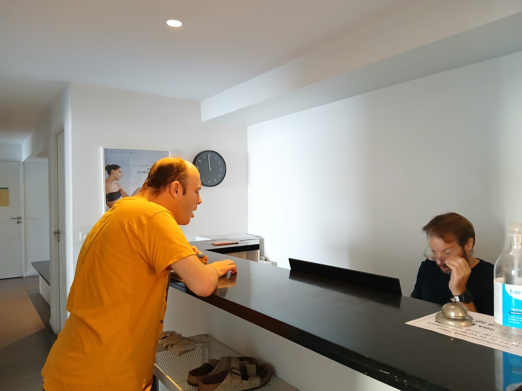 Après un bon petit déjeuner et une mise en beauté (douche, rasage, brossage des dents et coupe de cheveux), nous partons pour le rdv du kiné. Jéjé, attiré par l’assiette de Mathieu, s’accoude au comptoir comme s’il voulait prendre rdv. Puis Louise s’occupe de lui. Avec force et persévérance elle parvient à l’étirer un peu : Jéjé fait de la résistance.
