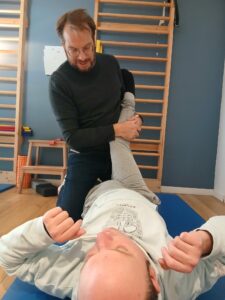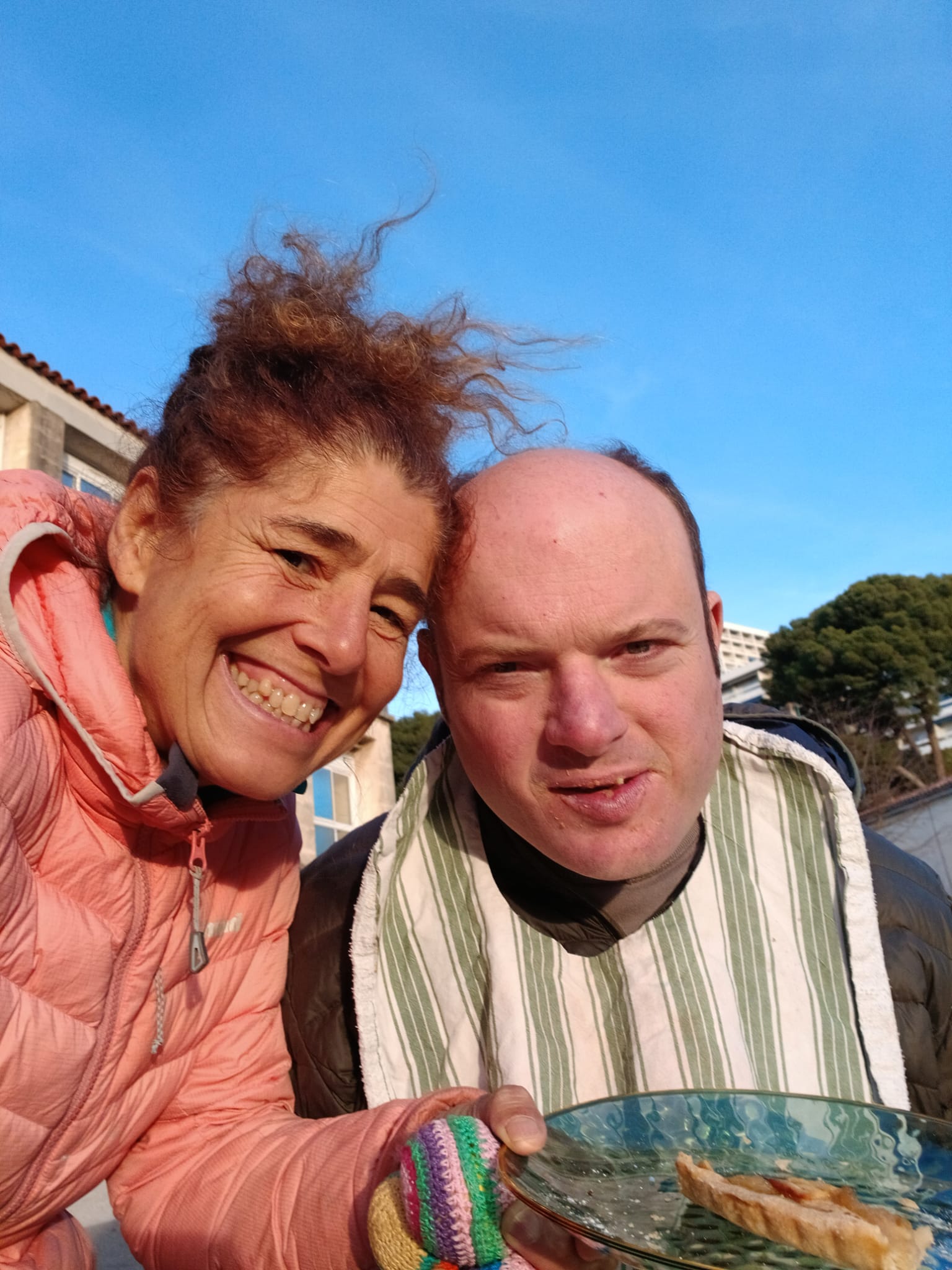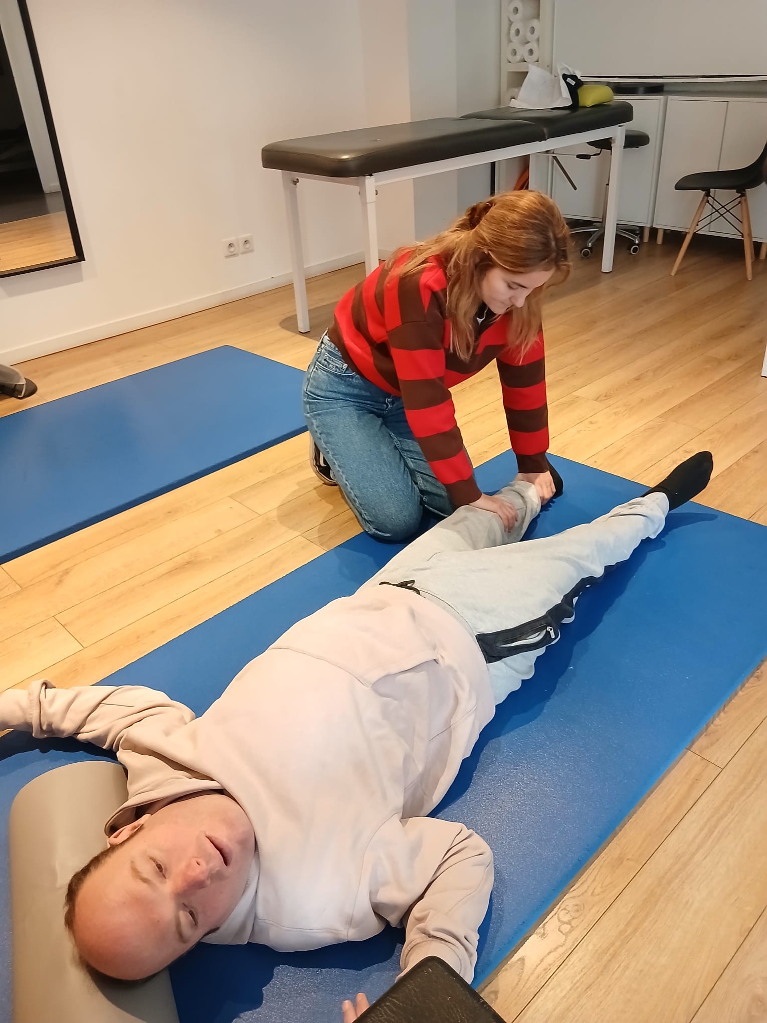 Après le rituel du matin lever, petit déjeuner, brossage des dents, douche, rasage et soin des pieds, nous partons au rdv du kiné avec Mathieu. Séance dynamique et sportive pour Mathieu qui s’occupe énergiquement de Jéjé.