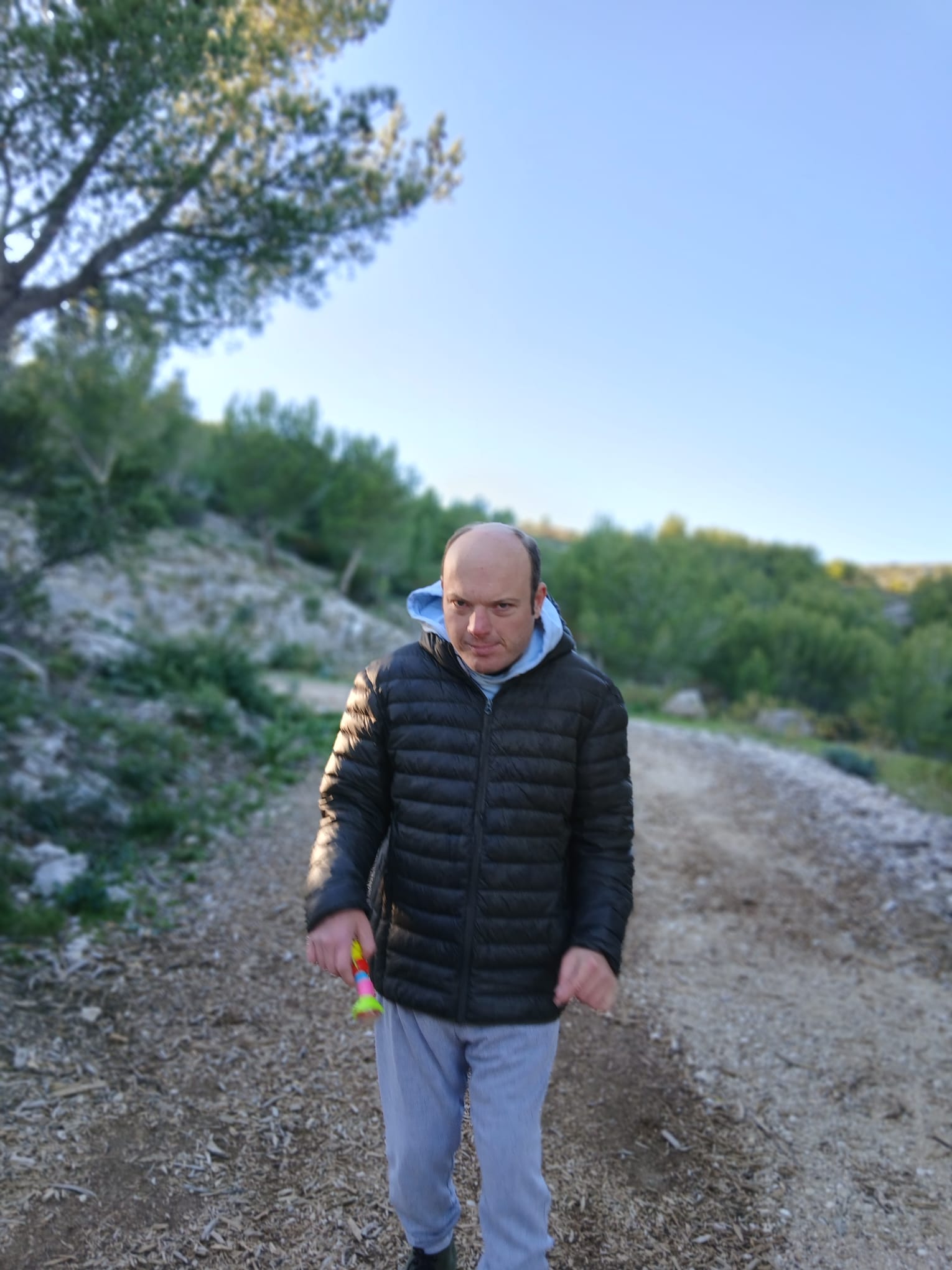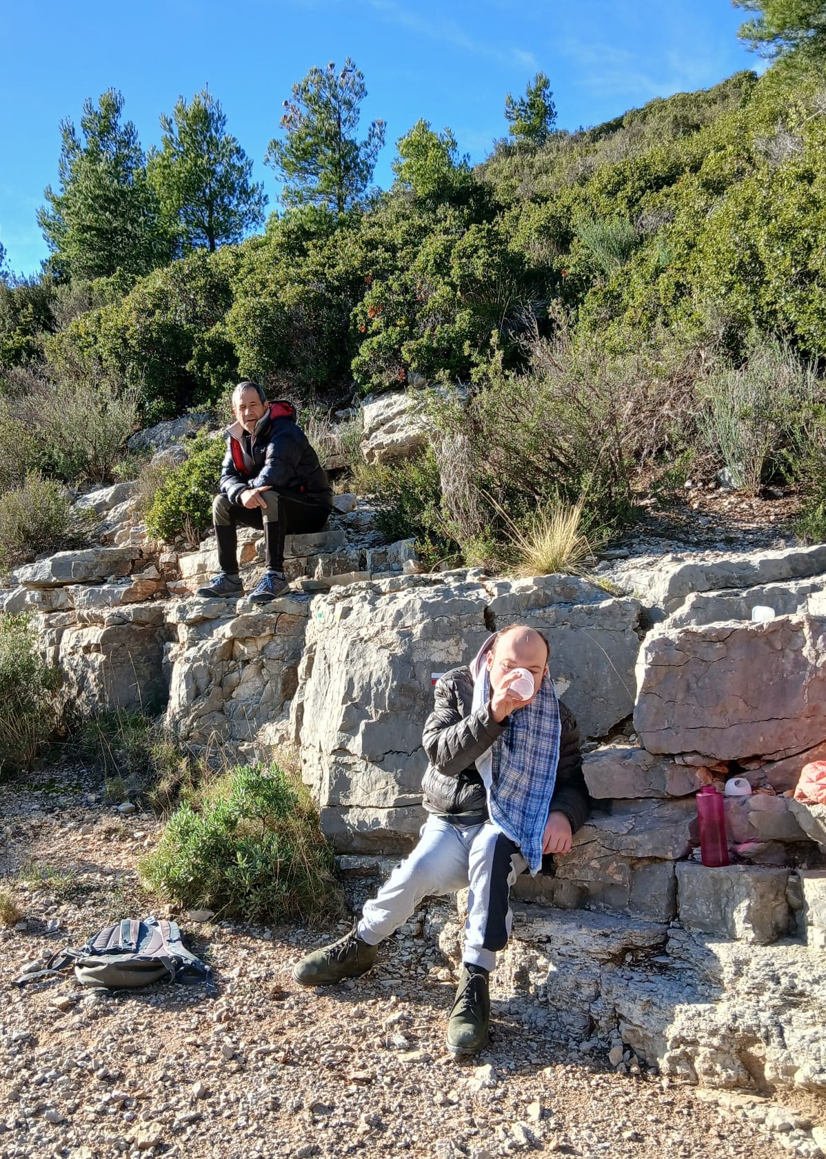 Après un bon repas à la maison et une courte sieste, nous partons au col de Sormiou accompagnés par Annick. Au départ nous devons braver les éléments, le sentir étant exposé au mistral. Mais plus on avance plus Jéjé se détend et apprécie l’effort. Il avance d’un pas régulier et avec le sourire. Que du bonheur.