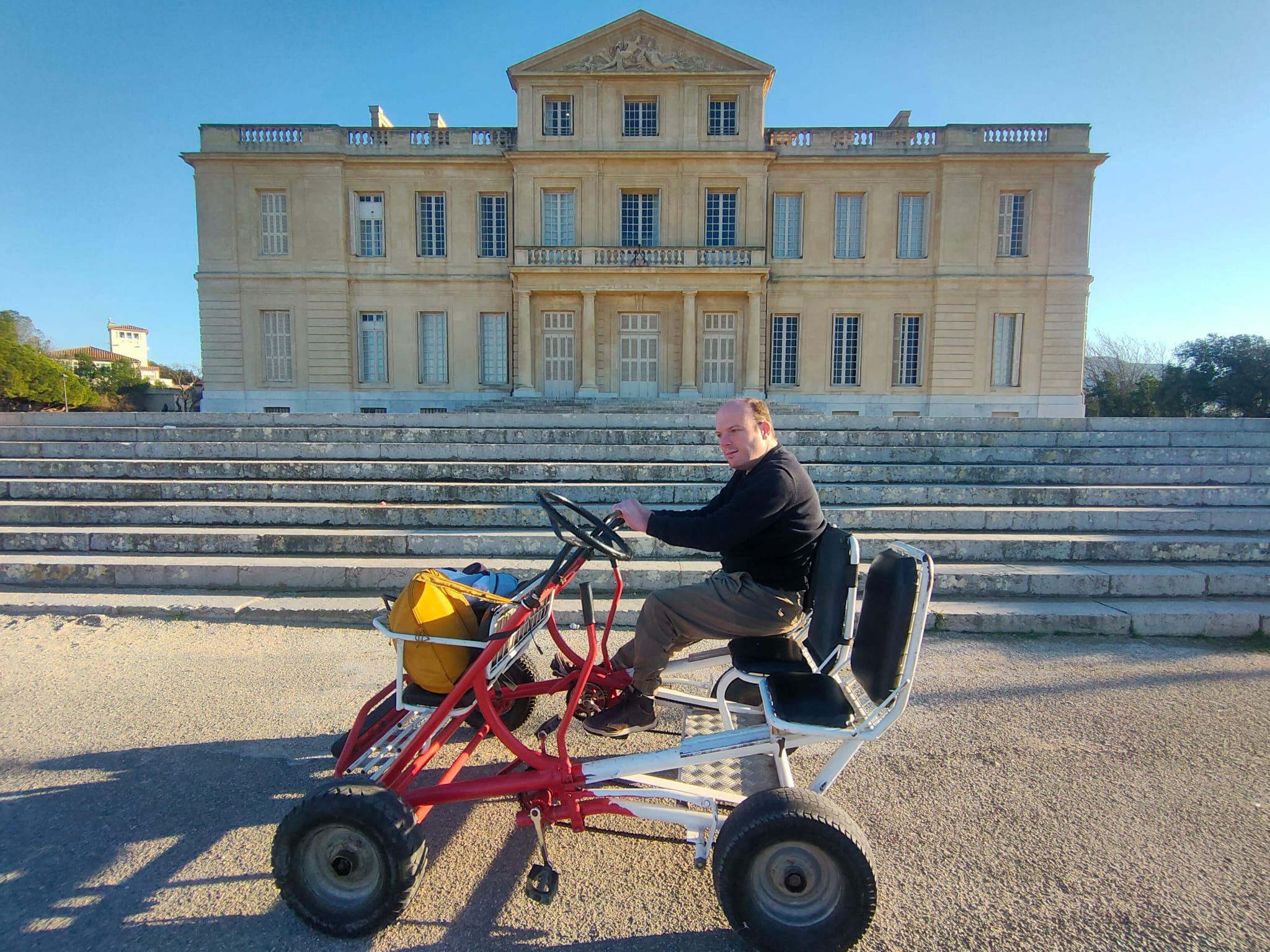 Jéjé a retrouvé sa forme et son équilibre, il marche à nouveau seul 😉 Nous avons rendez-vous chez le kiné entre midi et deux avec Mathieu cette fois-ci. L’après-midi nous allons marcher au parc Borély puis nous louons une rosalie pour le plus grand plaisir de Jéjé. Et oui je peux à nouveau pédaler pour deux, mon genoux est guéri 😉