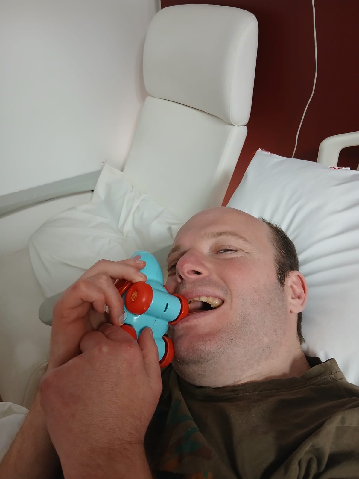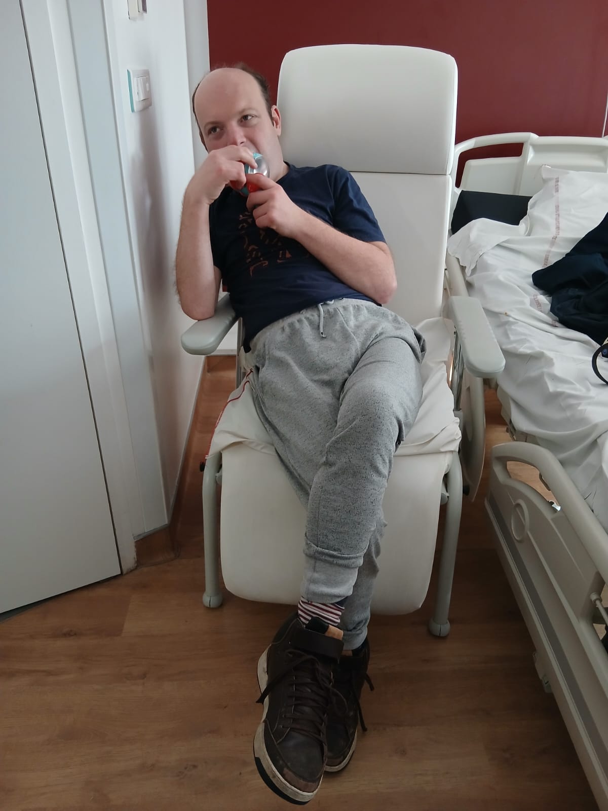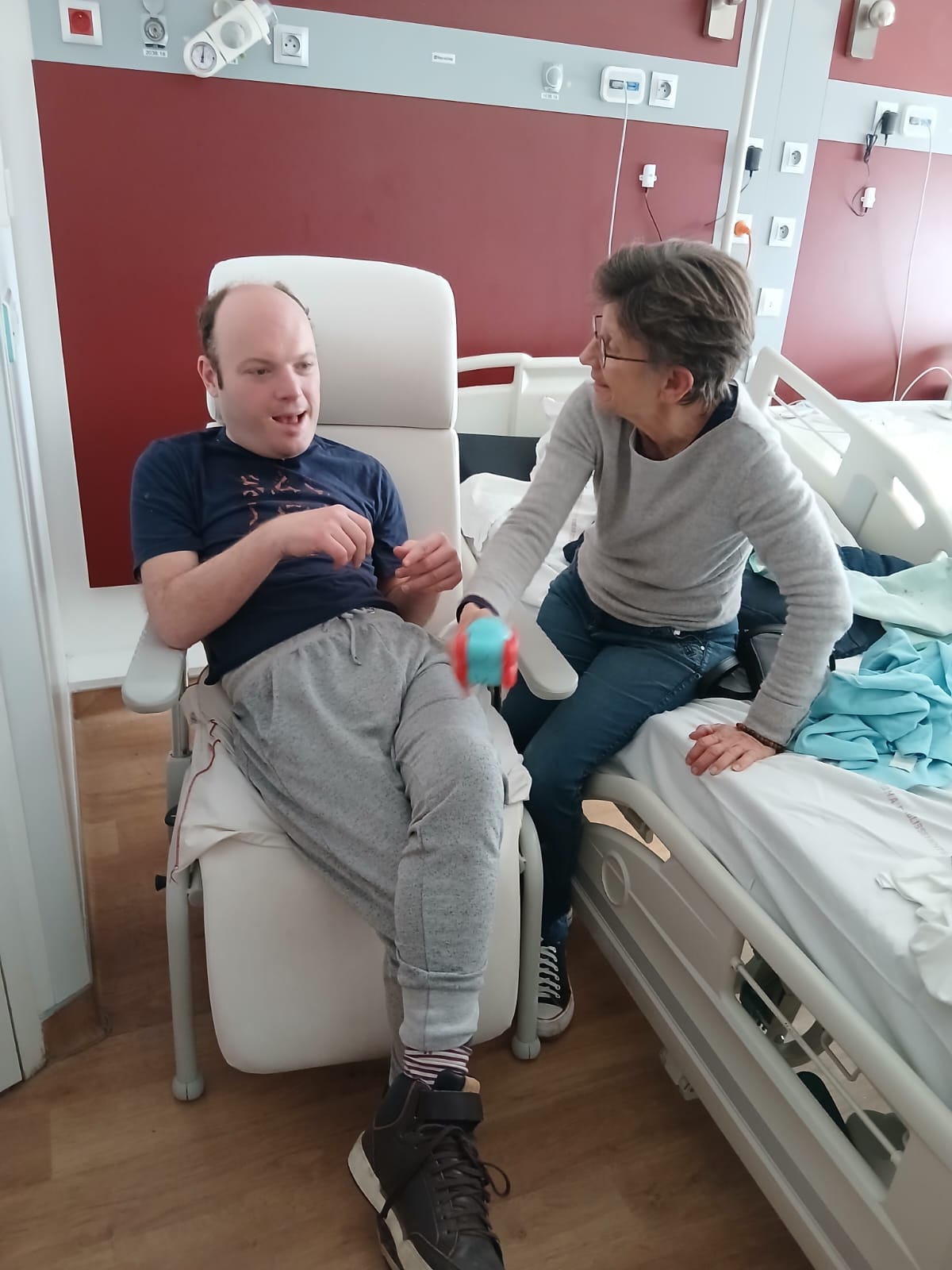 je prends le relais d’Annick à midi. L’infirmière de service a détecté une suspicion d’infection sur le sexe de Jéjé. Elle reviendra contrôler dans l’après-midi. Après le repas on mène Jéjé passer un EEG. Plutôt calme, l’examen se passe bien malgré quelques tentatives d’enlever son bonnet et j’arrive avec l’accord du praticien à le calmer. 20 minutes c’est long… Bravo Jéjé. Au retour nous avons la visite de Michelle qui apporte un bon flan que Jéjé apprécie beaucoup. Merci Michelle. Un nouveau malade partage la chambre. L’infirmière nous confirme que Jéjé n’a pas de MST mais que nous devons être plus rigoureux sur sa toilette intime en le décalottant à chaque douche chose que je négligeais. A voir avec l’équipe.