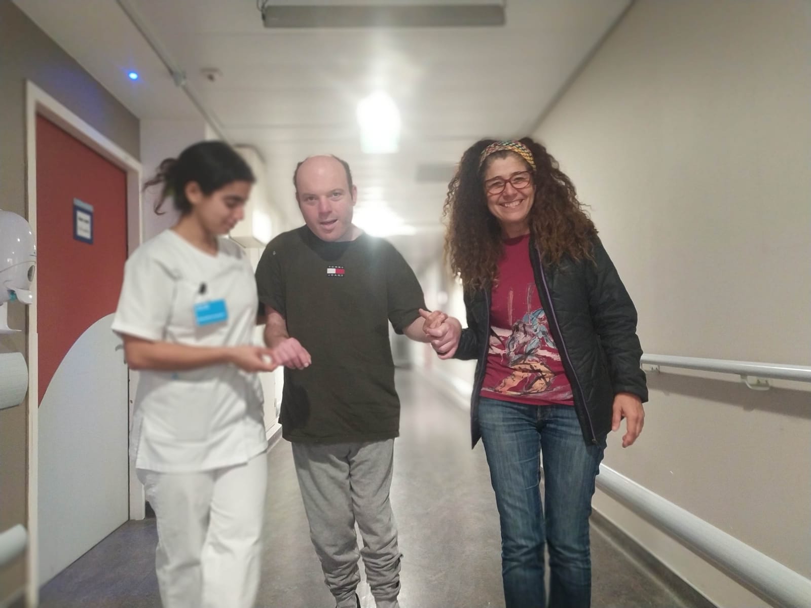 je remplace Annick à midi. Jéjé est toujours très endormi par les médicaments. Après le repas on part tous les deux marcher dans le couloir. Ça tangue un peu mais il avance. Visite simultanée de la kiné et d’Antoine et c’est reparti. Nous passons l’après-midi à balader tantôt en fauteuil tantôt en marchant avec de l’aide : cafétéria, piano, extérieur. Il retrouve son enthousiasme. Ça fait plaisir ! Il restera assez réveillé jusqu’à à 22h