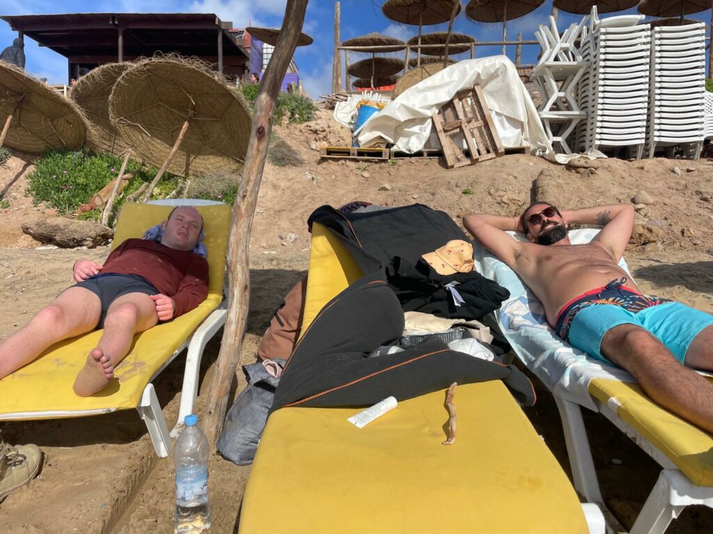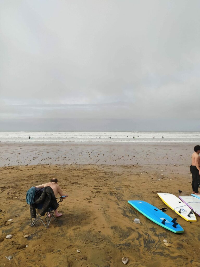 de jeunes surfeurs entre Aourir et Tamraght. On zone sur les transats, un peu dans